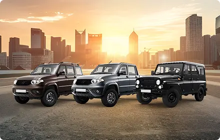 В нашем автосалоне представлены все актуальные модели завода УАЗ: внедорожник Патриот и его версия Хантер для бездорожья, грузовой Пикап с одинарной и двойной кабиной, коммерческая линейка Профи, а также легендарный УАЗ СГР в исполнениях Автобус, Фургон, Комби и Бортовой. Подберём модель под ваши задачи: охота и рыбалка, городская эксплуатация, грузоперевозки или корпоративный парк.